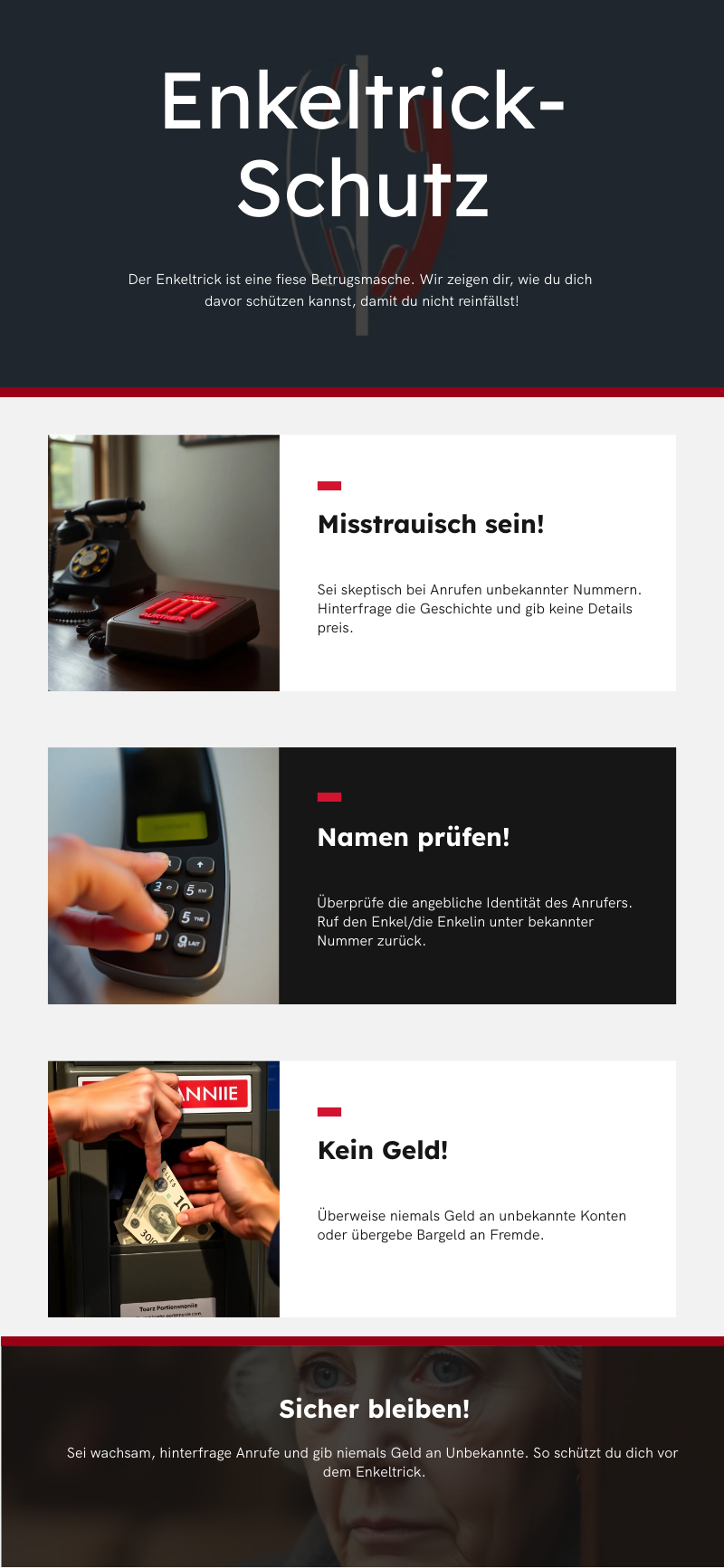 Der Enkeltrick ist eine Betrugsmasche, bei der sich die Täter als Verwandte ausgeben und um Geld bitten. Die Täter nutzen dabei die emotionale Bindung zwischen Opfer und Verwandtem aus.